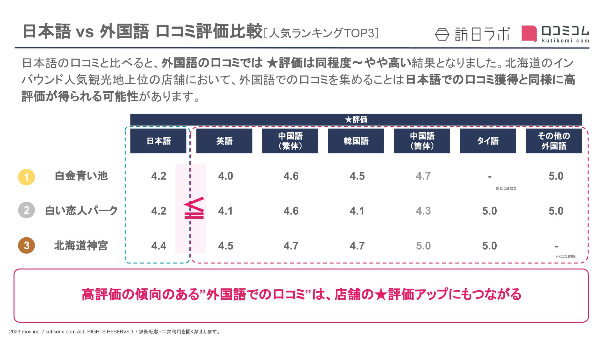 日本語の口コミと比べると、外国語の口コミでは ★評価は同程度〜やや高い結果となりました。北海道のインバウンド人気観光地上位の店舗において、外国語での口コミを集めることは日本語での口コミ獲得と同様に高評価が得られる可能性があります。