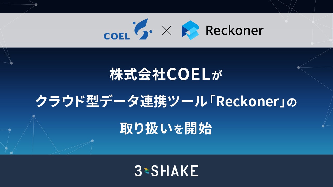 株式会社スリーシェイク(本社:東京都新宿区、代表取締役社長:吉田 拓真、以下スリーシェイク)は、パートナー企業である株式会社COEL(本社:愛知県名古屋市、代表取締役:深見 和久、以下COEL)が、クラウド型データ連携ツール「Reckoner(レコナー)」の取り扱いを開始したことをお知らせします。
