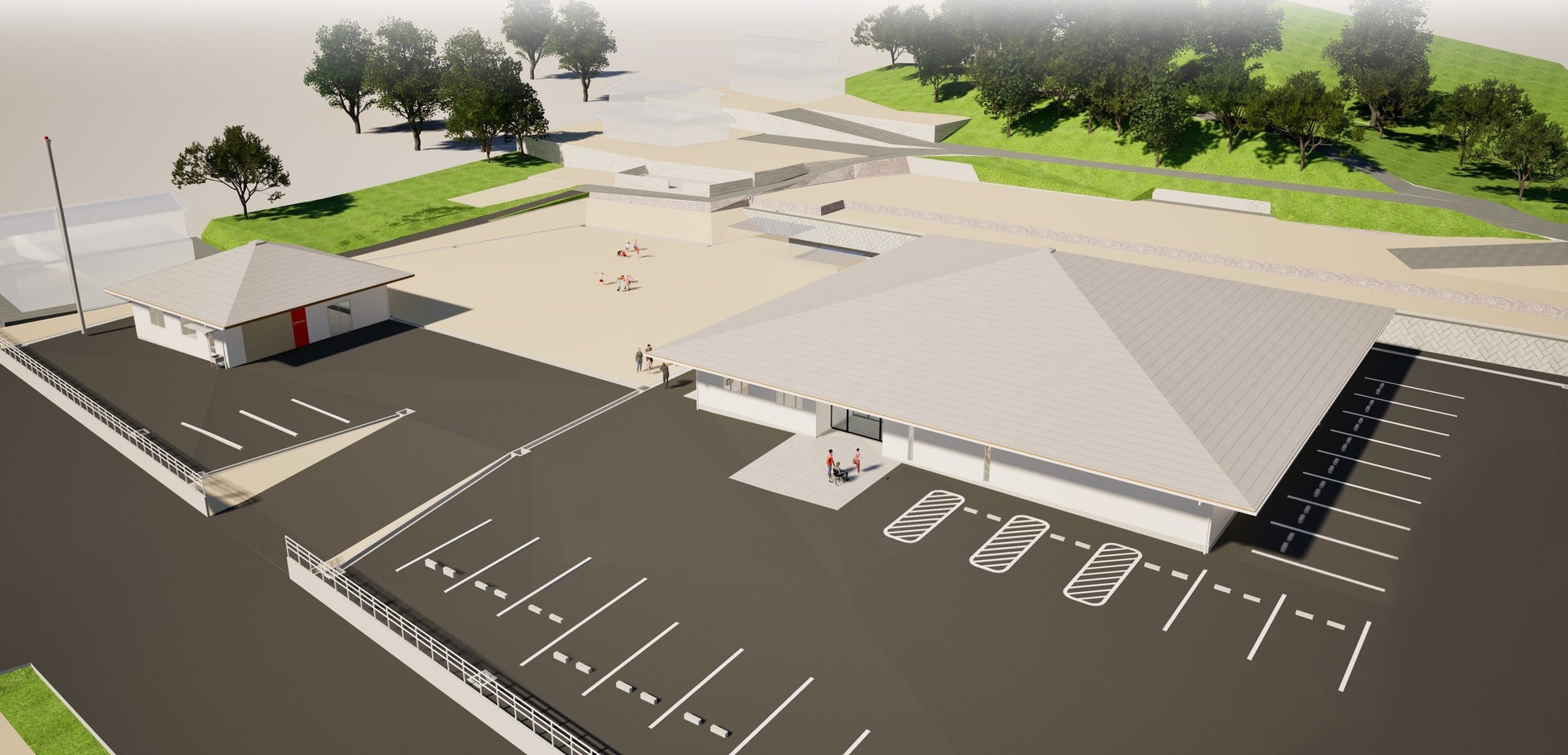 飯岡コミュニティセンターの敷地は、北側に位置する大平山山頂にある「月の輪古墳」に隣接しており、この貴重な歴史を次世代にしっかりと受け継いでいきたいという思いを込め、「月の輪の想いを紡ぐ飯岡の輝く未来」~歴史を受け継ぎ、賑わいと新たな絆を未来に紡ぐ交流拠点づくり~をテーマとしています。併設される消防車庫とともに、安全・安心を最優先とした施設づくりを進め、地域に愛されることはもちろん、町外から訪れる人々をも惹きつけ、「ここにしかない価値」を創造する施設の実現を目指します。