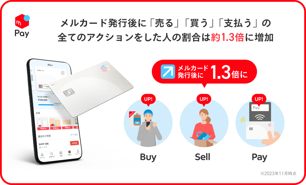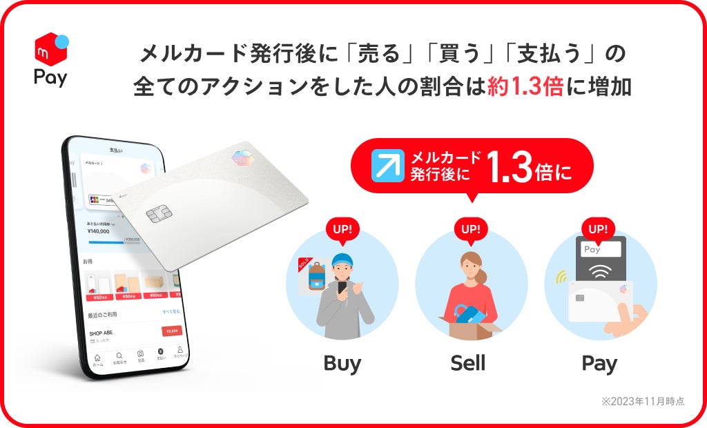 「メルカード」利用者の利用実績を調べたところ「メルカード」発行後、「売る」「買う」「支払う」の3つ全ての行動をしている方の割合が、「メルカード」発行前に比べて1.3倍になっていることがわかりました。このことから、カード発行後にメルカリ内外でのお買い物行動が活発化していることが分かりました(※4)。