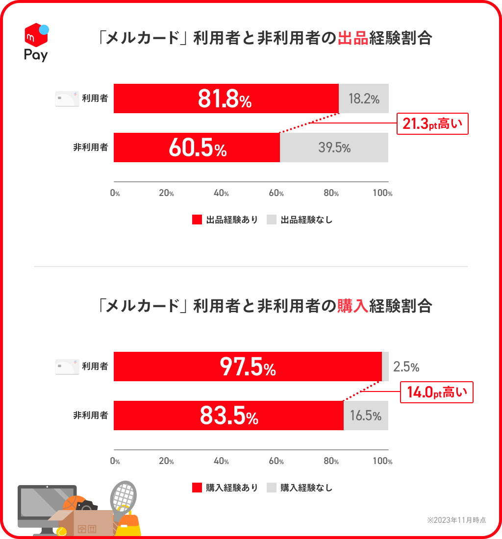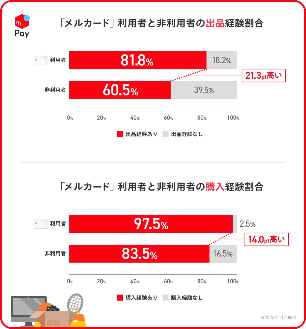 また、「メルカード」利用者の81.8%がメルカリ内での出品経験があり、非利用者(60.5%)と比較して21.3pt高く、購入経験においても「メルカード」利用者の97.5%がメルカリ内での購入経験があり、非利用者(83.5%)と比べて14.0pt高いことがわかりました。