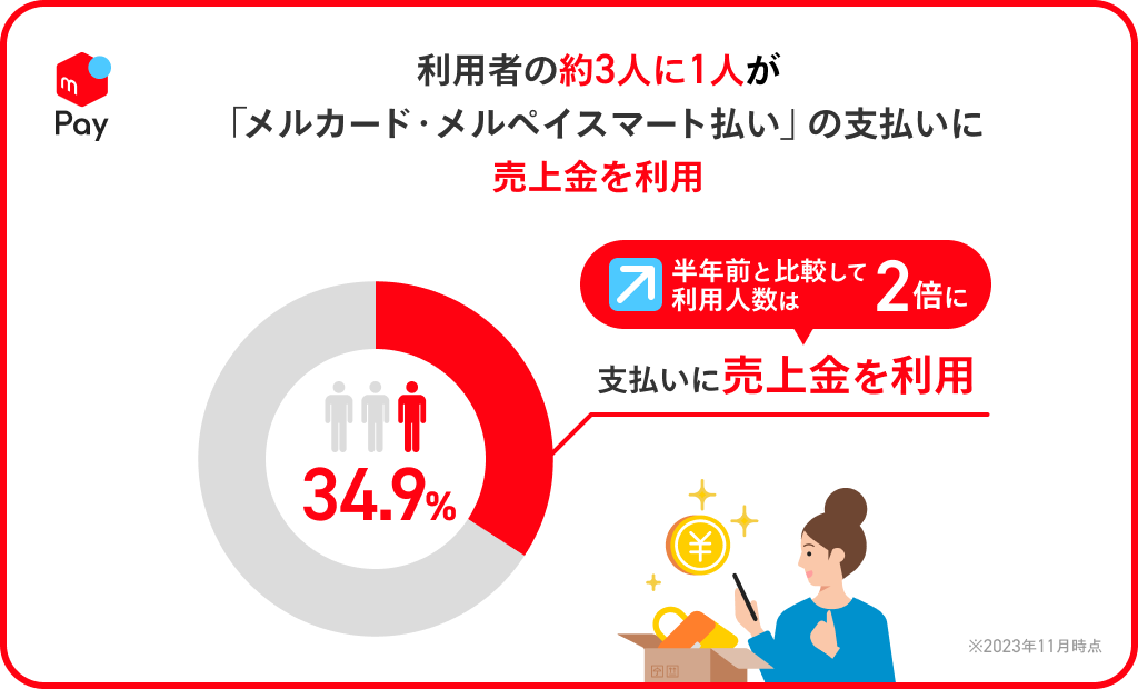 「メルカード」は「メルカリ」の売上金を支払いに充てることができ、支払いはひと月分をまとめて行うだけでなく、個別に利用分を選んで先に清算いただくことも可能です。また、2023年10月には清算後すぐにポイントが付与される機能を追加し、支払いの柔軟性・管理のしやすさなど利便性を向上してまいりました。2023年9月の「メルカード」利用者の調査に引き続き、3人に1人(約34.9%)の方が「メルカード・メルペイスマート払い」の支払いに売上金を利用していることが分かりました。また、「メルカード・メルペイスマート払い」の支払いに売上金を利用する人の数は半年前の倍以上に増加しており、徐々に浸透していることが分かりました(※3)。