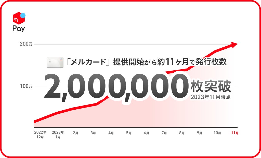 株式会社メルペイ(以下、メルペイ)は、2022年11月8日より、「メルカリ」の利用実績等で限度額が決まり、アプリで利用と管理が完結するクレジットカード「メルカード(※1)」の提供を開始し、すべてのお客さまが申込可能となってから(2022年12月1日)、1年足らず(約11ヶ月)(※2)でカード発行枚数200万枚を突破したことをお知らせいたします。