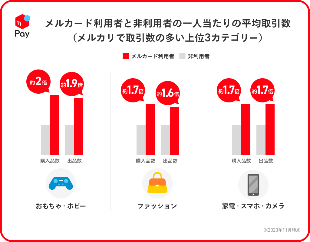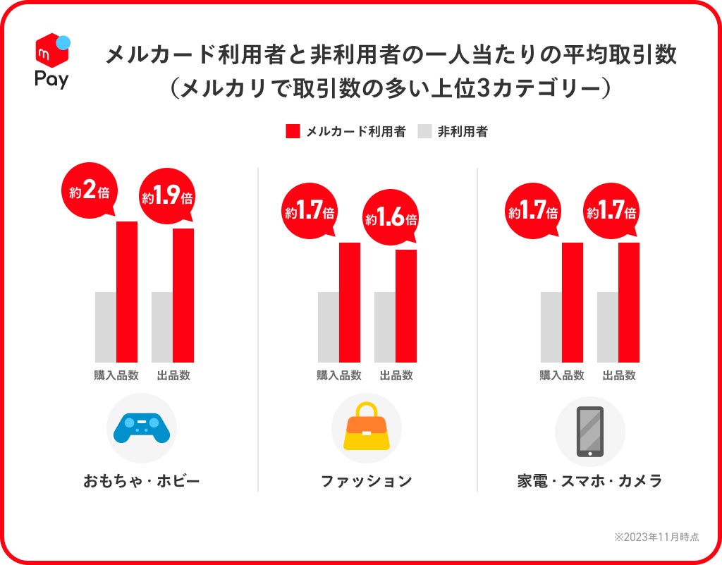 「メルカード」の利用者は、非利用者に比べると「メルカリ」における人気カテゴリー上位3つにおいて、出品数・購入数が多い傾向がみられました。非利用者に比べるといずれのカテゴリーでも1.6倍、最も人気な「おもちゃ・ホビー」カテゴリーの購入品数においては2倍となり、人気カテゴリーの取引量に差があることが分かりました。