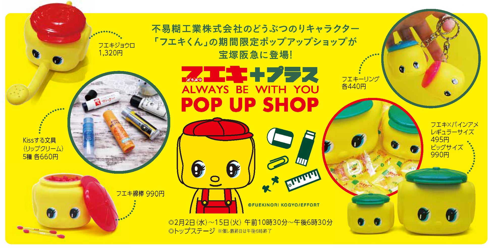 オリジナル商品の企画・制作・販売を軸に、企業・組織のトータルブランディングを手掛ける株式会社ヘソプロダクション(本社:大阪市福島区・代表取締役:稲本ミノル)は、2022年2月2日(水)〜2月15日(火)までの期間、宝塚阪急トップステージにて、不易糊工業株式会社のどうぶつ糊のキャラクター「フエキくん」のポップアップショップ『フエキ POP UP SHOP+』を期間限定開催いたします。