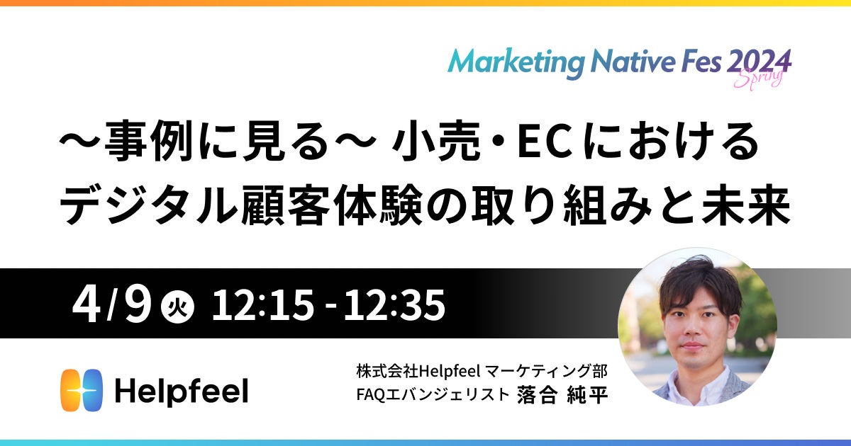 株式会社Helpfeel(京都府京都市、代表取締役/CEO:洛西 一周、以下 当社)は、2024年4月9日(火)に開催される小売企業のマーケター向けオンラインイベント「Marketing Native Fes 2024 Spring」に協賛し、当社 マーケティング部FAQエバンジェリストの落合が登壇することをお知らせいたします。
