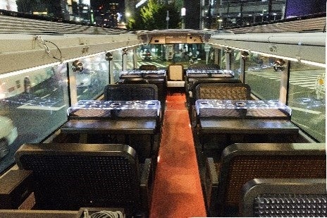 対面式の座席とテーブルを備え、透明で開閉可能なオープンルーフは開放感があり、いつもと違う目線から眺める景色と、本格的な料理をお楽しみいただけます。東京レストランバスの外装は、東京らしさをイメージし、多数のビル群や観光名所を“食”と掛け合わせてポップなカラーリングでデザインしています。内装は、シックな色合いでまとめ、夜は調光可能なLEDと間接照明により、高級感あふれる落ち着いた空間になっています。