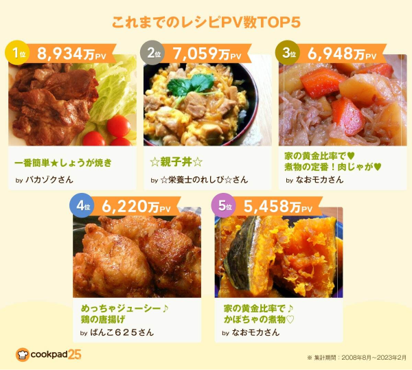 クックパッドでは2008年の計測開始以来、15年間で約701億回以上*3のレシピが閲覧され、今まで閲覧された上位レシピは、しょうが焼きや親子丼、肉じゃがなど日常の料理であるということがわかりました。