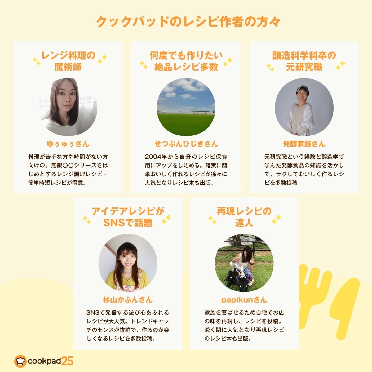 クックパッドは多くのレシピ作者の方々の投稿に支えられ、25周年を迎えることができました。アイデアに溢れたレシピ作者の方々の一部をご紹介します。