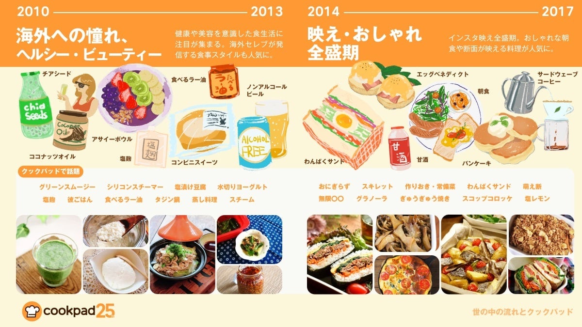 クックパッドは日々皆さまにご利用いただいてきたため、流行や社会情勢が検索内容に反映されてきました。クックパッドの食の検索データサービス「たべみる」のデータをもとに、2010年から年代ごとに振り返ります。