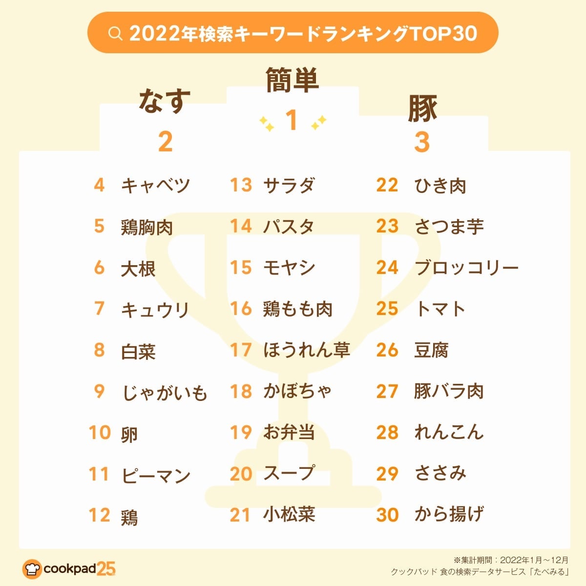 - 検索されたキーワードは累計約15万語で、2022年の上位は「簡単」「なす」「豚」