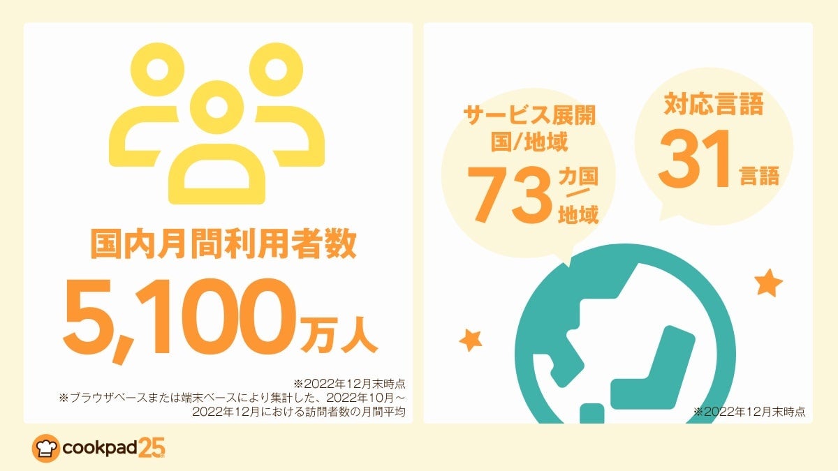 料理レシピ投稿・検索サービス「クックパッド」は1998年3月にレシピ投稿の場としてサービスを開始しました。その後検索機能が追加され、現在は国内月間利用者数約5,100万人、総レシピ数約380万品にのぼる日本最大のレシピサービスへと成長しました。日々ご利用いただく皆さまの支えがあってこそ25周年を迎え、ここまで成長することができました。