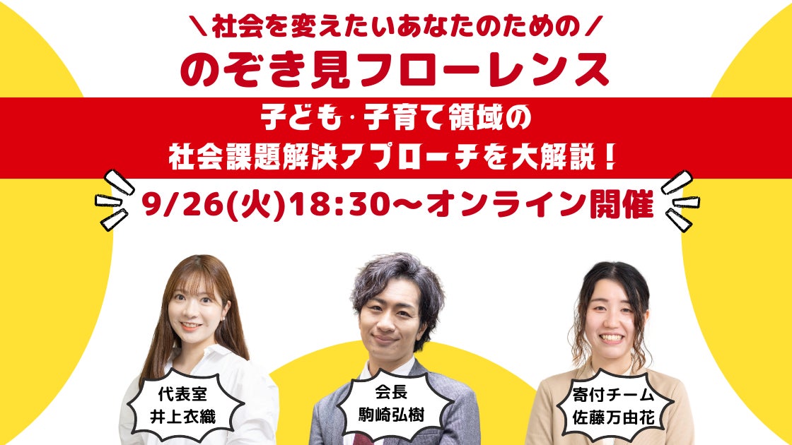 本イベントでは、フローレンスが今後目指す未来像について、フローレンス会長の駒崎からお話します。また、経営直下チーム「代表室」で政策提言や事業開発を担う井上衣織と、「みんなで社会変革事業部寄付チーム」で法人寄付担当として社外からも子ども・子育て支援の輪を広げるミッションを担う佐藤万由花が登壇!子どもたちを性被害から守る「日本版DBS」の政策提言の取り組みや、子どもたちの夏休みの体験格差解消を目指した「夏休み格差をなくそうプロジェクト」などの事例をもとに、私たちフローレンスがどのように子ども・子育ての社会課題に取り組んできたのか解説します!