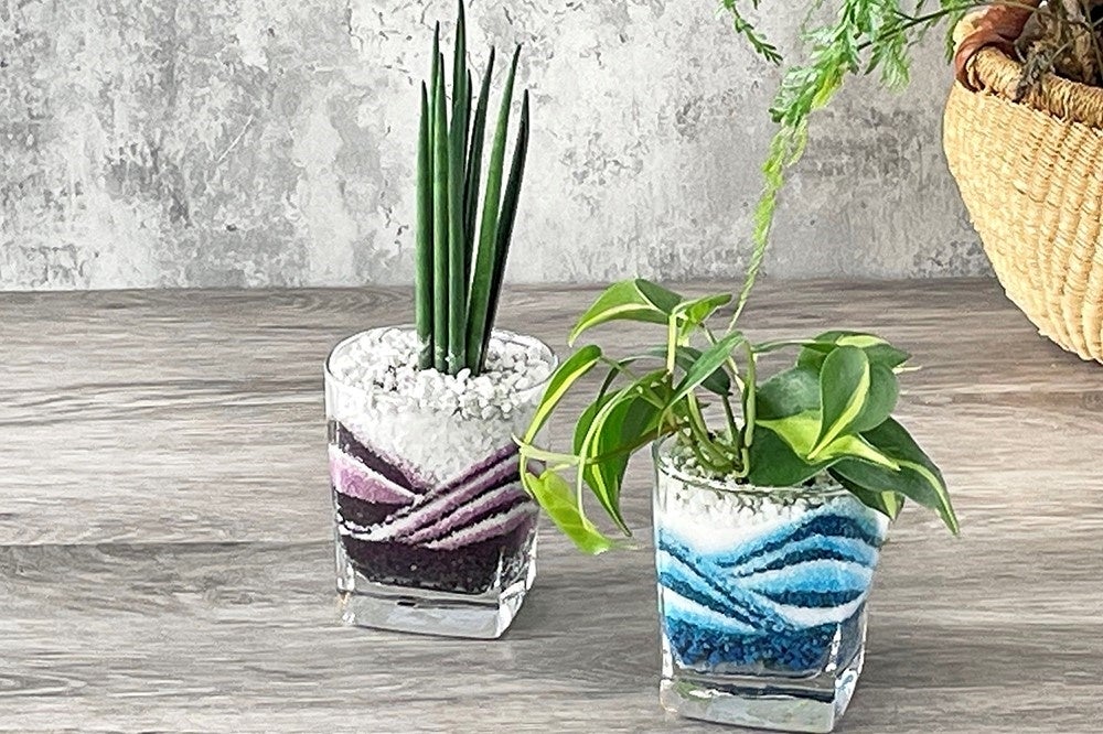 色のついた砂でデザインを楽しめる寄せ植えです。ぜひご参加ください。