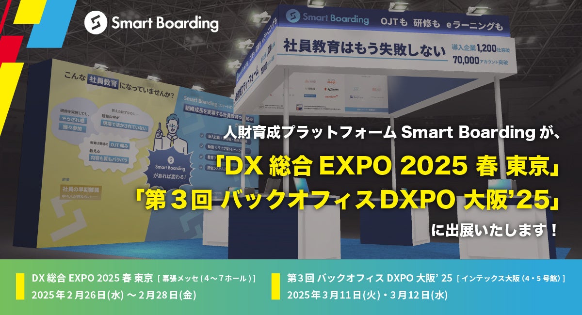 人財育成プラットフォームSmart Boardingが、2/26-28「 DX 総合EXPO 2025 春 東京」 3/11-12「第3回 バックオフィスDXPO 大阪’25 」 に出展いたします!