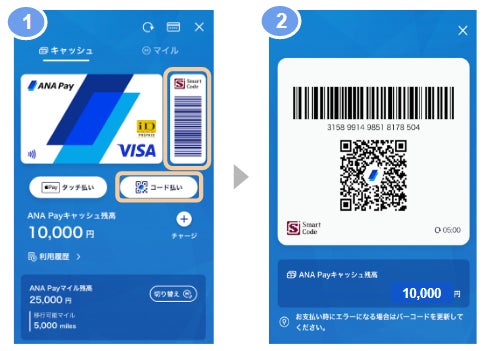本機能の提供開始により、ANAのマイルが貯まる、使える「ANA Pay」において、従来のタッチ決済に加え、「コード払い」ができるようになります。お客様は、アプリ上からバーコードを表示し、店舗側のレジで読み取っていただくことで、決済を行うことが可能になります。