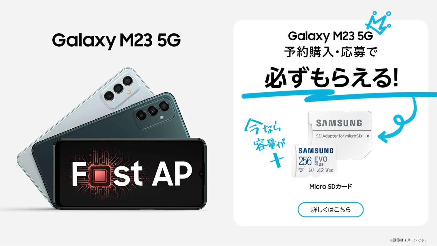 また、対象期間中に「Galaxy M23 5G」を予約期間購入・ご応募いただいたお客様全員に、「Micro SDカード(256GB)」をプレゼントする日本上陸記念「Galaxy M23 5G」予約期間購入キャンペーンを実施いたします。※ページ下部のキャンペーン詳細をご確認ください。