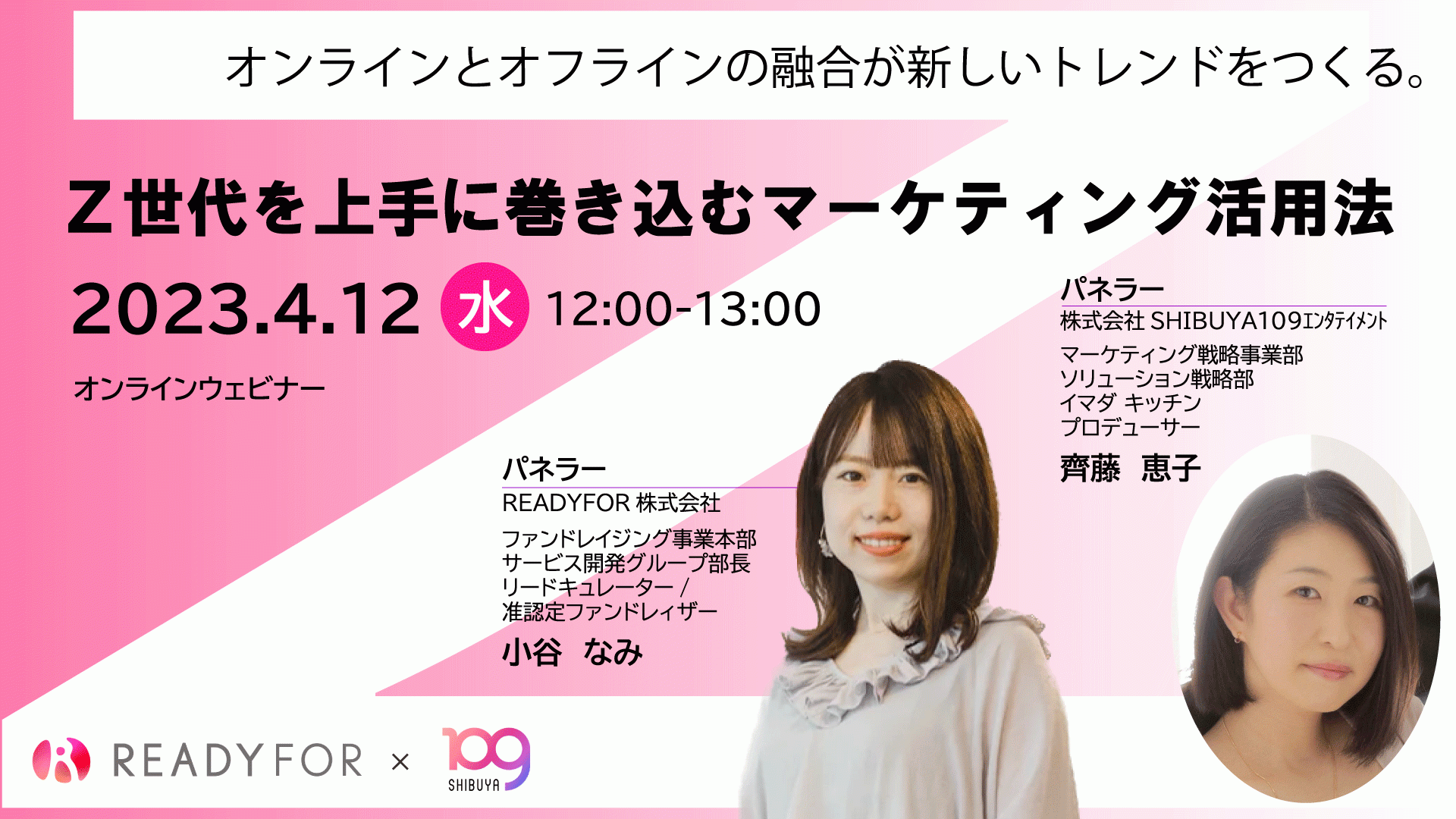 日本初・国内最大級のクラウドファンディングサービス「READYFOR」を運営するREADYFOR株式会社は、2023年4月12日(水)に、株式会社SHIBUYA109エンタテイメントと共催ウェビナー「オンラインとオフラインの融合が新しいトレンドをつくる。Z世代を上手に巻き込むマーケティング活用法」を開催いたします。