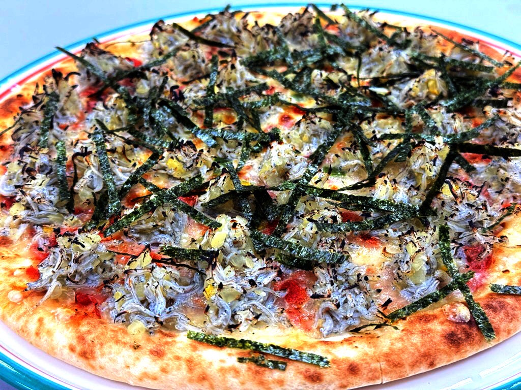 香ばしく焼き上げたピッツァ生地に、風味豊かな白洲干しと焼き海苔をトッピング。磯の香りが口いっぱいに広がる和のテイストを取り入れたユニークなピッツア。ミックスチーズとの相性も抜群で、新たな美味しさをお楽しみいただけます。