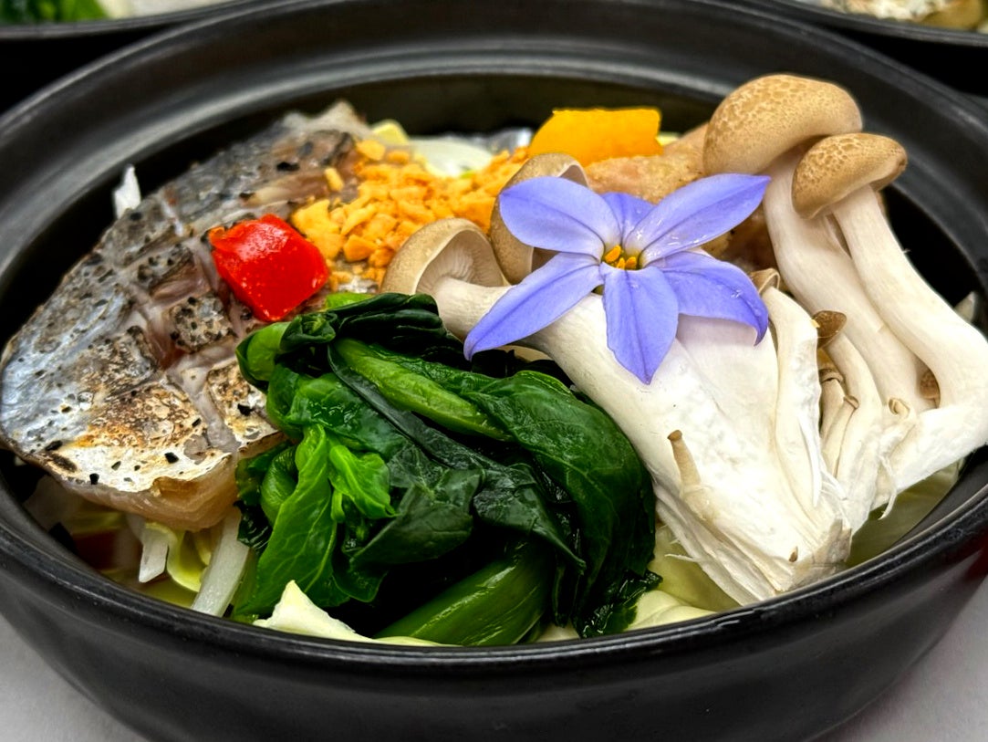 旬の鰆と柔らかな若鶏を春の訪れを告げる菜の花、しめじと共にガーリックオイルで焼き蒸しにしました。魚介と鶏肉の旨みが溶け出し、食欲をそそるガーリックの香りが全体をまとめます。