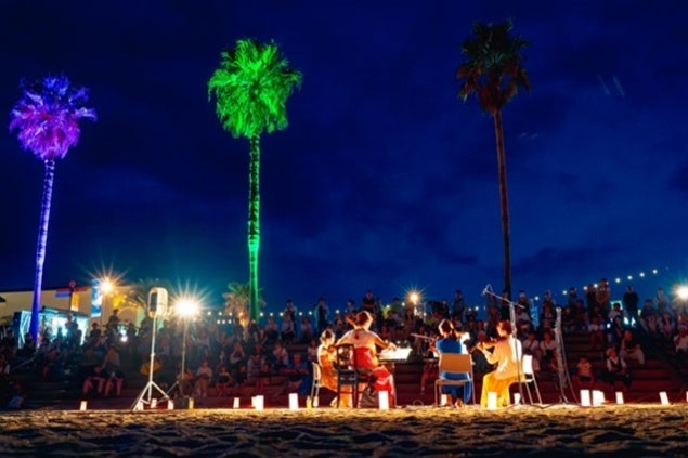 【泉南市】楽器の音色とカラフルなライトアップが泉南のビーチを美しく彩る。2024年8月17日(土)「Aurora Palm Tree×海辺の夜市with日本センチュリー交響楽団」開催!