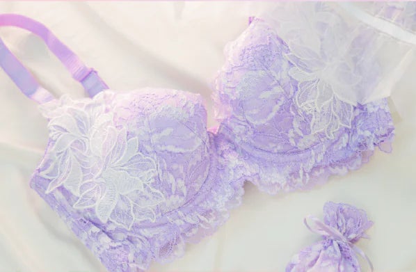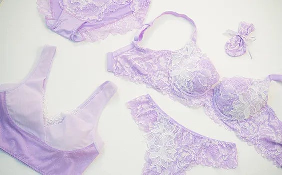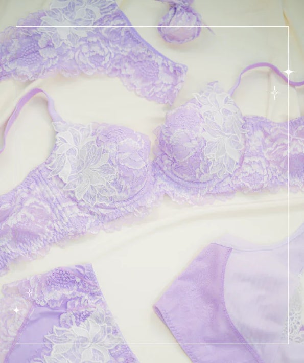 今回登場した限定デザインは、落ち着きのある大人の色気が漂い、華やかさの中にも品格が感じられるアメジストカラー。光沢のあるパープルのレースに大花のアップリケを大胆にあしらいました。かわいらしさの中に散りばめられた上品さが、これからの季節のファッションを楽しませてくれます。