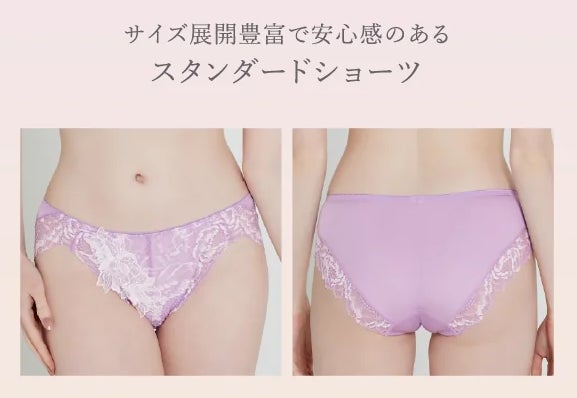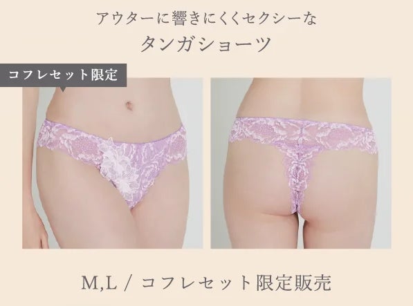 ブラジャーと相性抜群のショーツもセット。サイズ展開が豊富なスタンダードショーツと、アウターに響きにくくセクシーなタンガショーツからお好みのタイプが選べます(タンガショーツはコフレセット限定商品となります)。