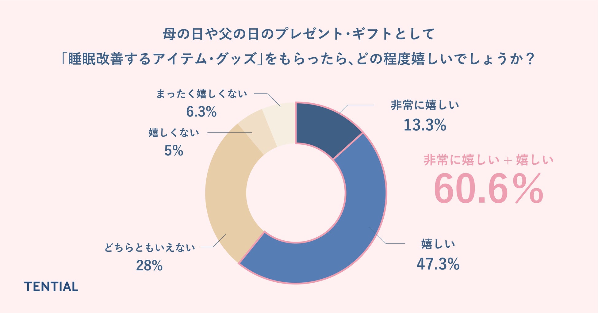「母の日・父の日に“睡眠改善アイテム”をもらったら嬉しいか?」という問いに対し、60.6%が「嬉しい」「非常に嬉しい」と好意的な回答を寄せました。ギフトとしての実用性の高さに加え、“気遣いが伝わる”ことでも支持を集めており、“ととのう睡眠”を贈ることへの支持が高まっています。
