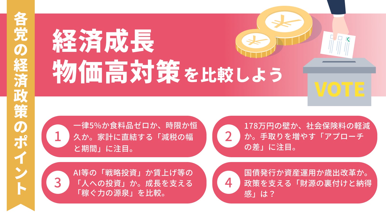 各党の経済政策について公約をわかりやすくまとめ、『PoliPoli』にてスライド形式で公開・解説します。