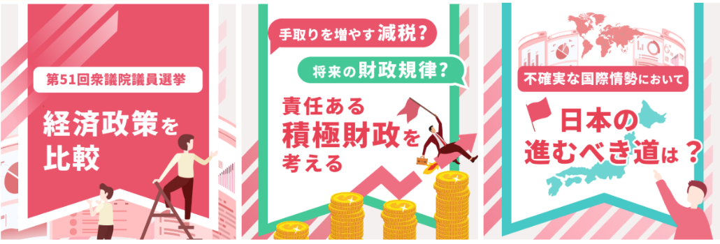 本企画では、衆議院選挙において特に注目される各政党の政策をテーマごとに深掘りし、わかりやすいコンテンツとして発信します。さらに、各党へのインタビューを通じて、政策の背景や意図を直接お届けすることで、有権者の皆様の理解を一層深める一助になればと考えています。