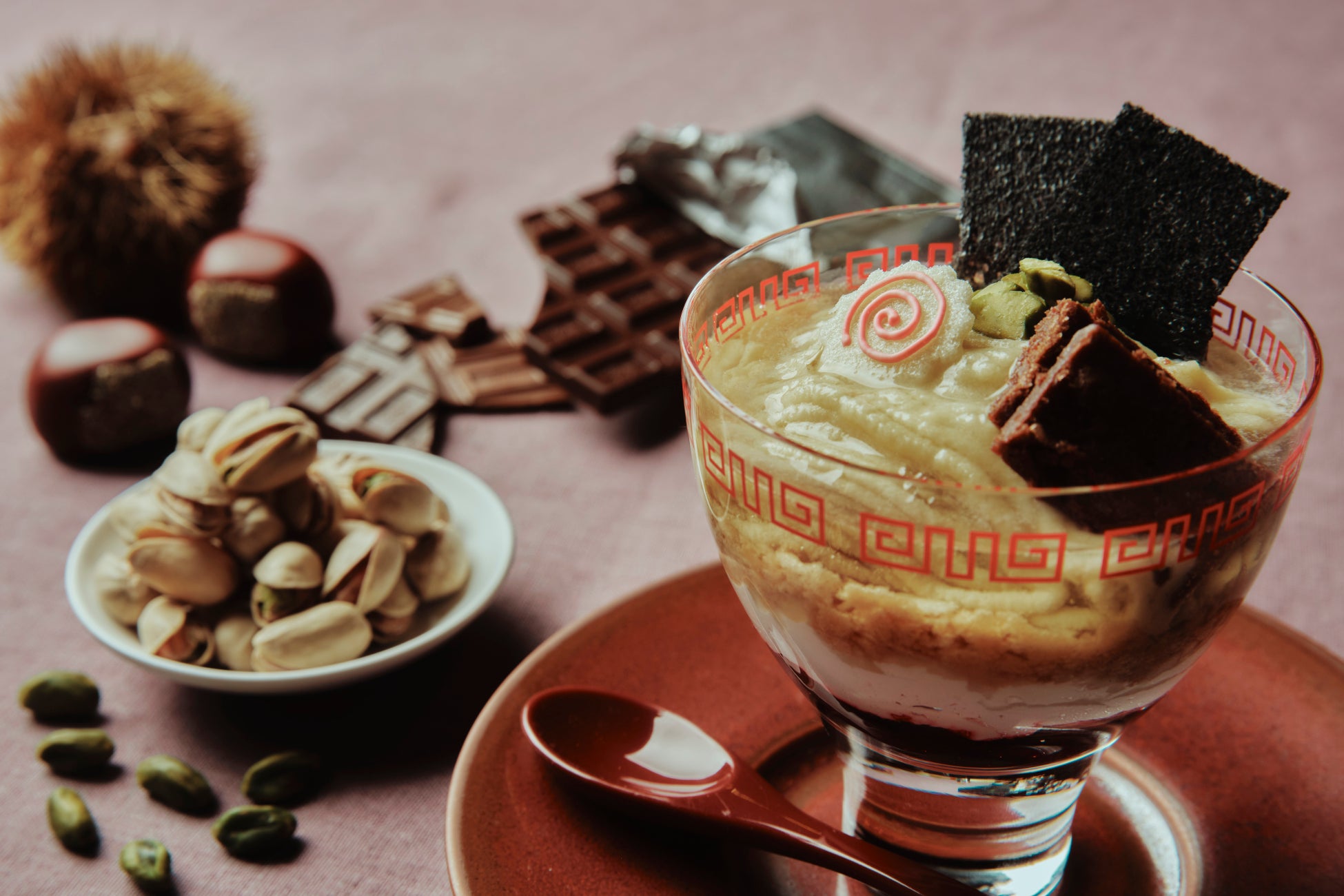 ラーメンどんぶりパフェは、旭川市民のソウルフードである旭川ラーメンと、北海道の文化である〆パフェを掛け合わせて誕生したオリジナルスイーツ。麺はマロンペースト、スープはラム酒のジュレにハスカップとカシスのソースを使用しています。さらに、パフェにトッピングされている具材もスイーツ。ナルトはラングドシャ、チャーシューはガトーショコラでできています。麺や具材で甘さを楽しみながらも、ソースの酸味でさっぱりと食べることができる、まさに〆にぴったりなパフェです。