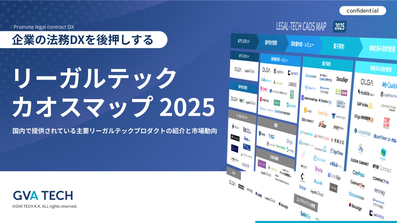 GVA TECH株式会社(本社:東京都渋谷区、代表取締役:山本 俊、以下GVA TECH)は、「企業の法務DXを後押しするリーガルテックカオスマップ 2025」を公開したことをお知らせいたします。