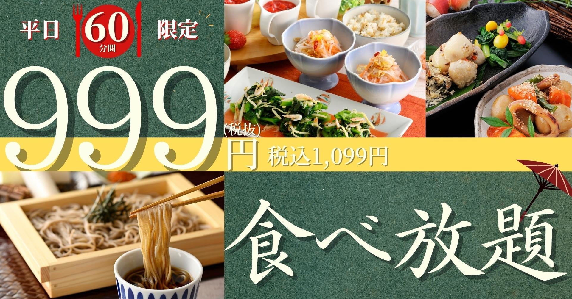【和のごちそうで至福の60分間‼】ニラックスブッフェで大人気の「45分間999円(税抜)特別コース」を、期間限定にて「制限時間60分間」に拡大いたします!