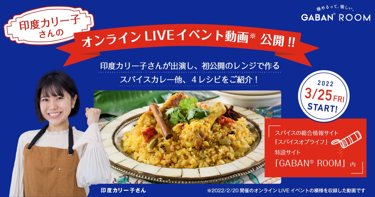2022年2月20日(日)に、消費者の皆様と双方向のコミュニケーションを図り、製品・コンテンツ開発に活かすことを目的に、これまでの「GABAN® ROOM」と「スパイスオブライフ」のキャンペーン参加者を無料招待し、『印度カリー子さんが生出演!GABAN®スパイスレシピをLive配信で堪能しよう』と題したYouTubeライブを実施しました。