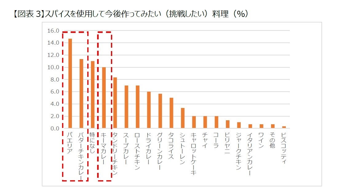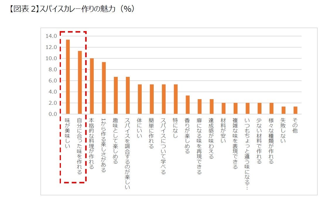 「スパイスカレー作りの魅力」では、「味が美味しい」の割合が高く、次いで「自分に合った味を作れる」点にも魅力を感じていることが明らかになりました。また、スパイスを使って作ってみたい料理としては、「パエリア」「バターチキンカレー」「キーマカレー」が上位でした。