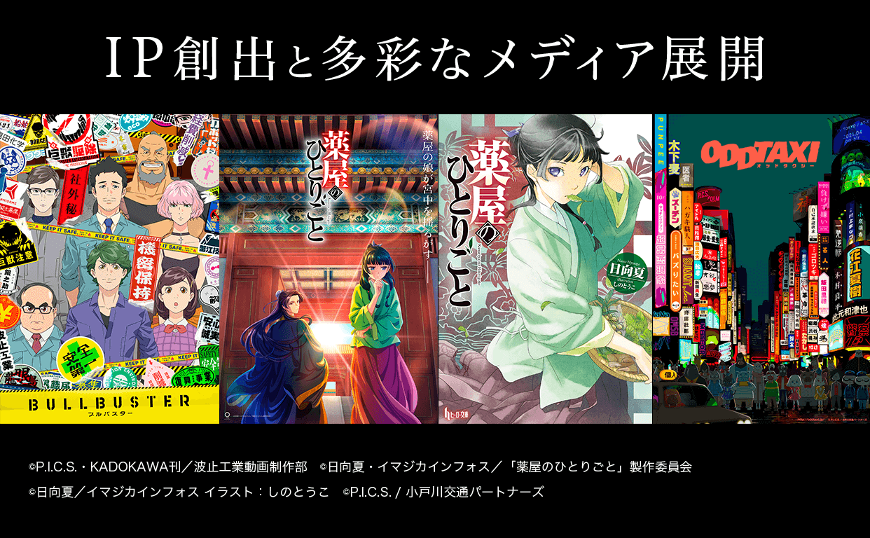 IMAGICA GROUPでは、クリエイターがゼロから生み出す自社開発のIPと、外部より発掘したIPを、マンガ、アニメ、映画、ドラマなどマルチメディアに展開し、国内のみならずグローバルに提供していくことで、IP価値の拡大を推進しています。当ページでは、当社グループの主要IPやIPを活用した取り組みなどの最新情報をお届けしてまいります。ぜひ、ご覧ください。