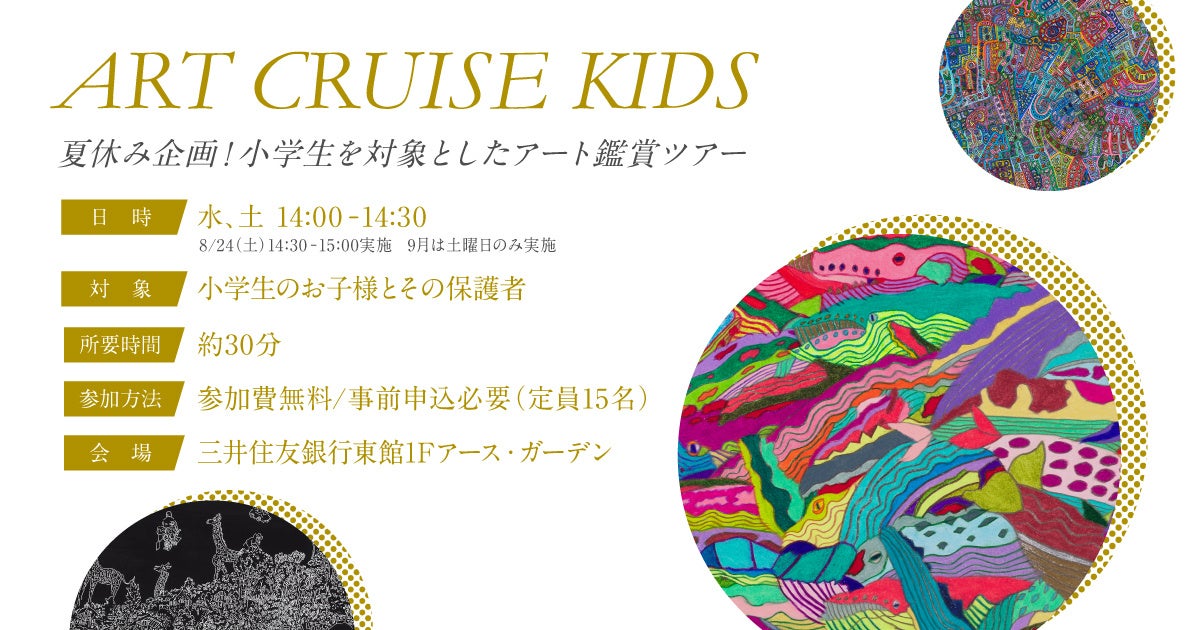 夏休み企画として、お子様にもアートをより身近に感じていただけるよう、小学生のお子様と保護者の皆様向けのアートクルーズを実施いたします。また、会期中いつでもご参加いただけるクイズラリーもご用意しています。