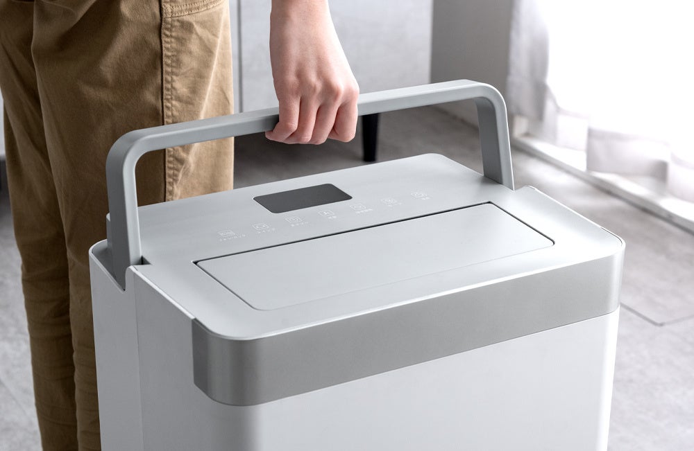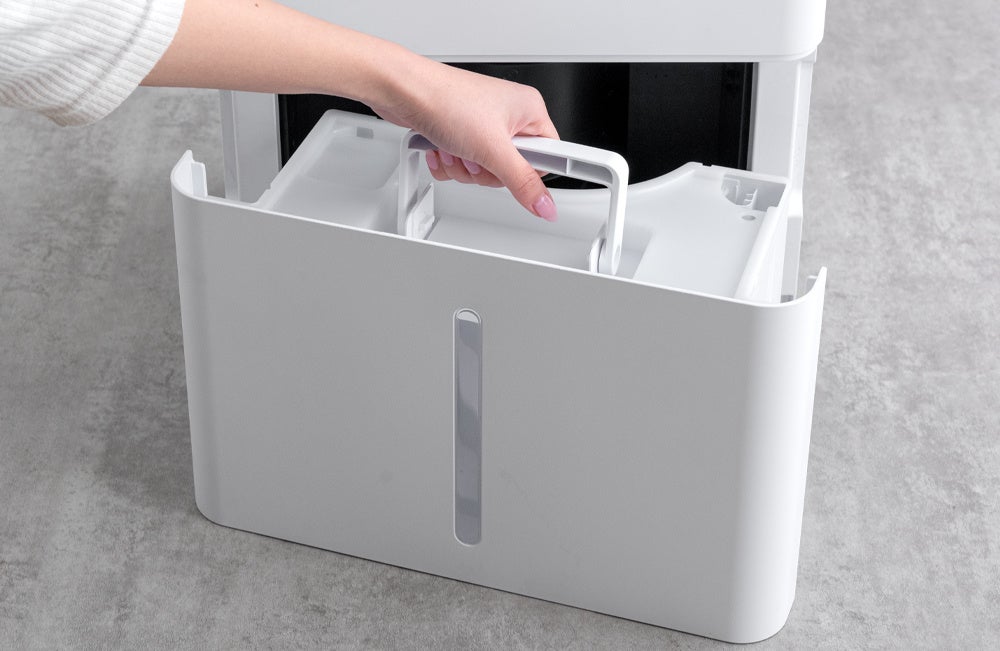 持ち運びの際に便利なキャスターと取っ手が付いています。優れた除湿性能と大型タンクで大きくなった本体を楽に移動することができ、好きな場所で使えるほか、収納の際にも役立ちます。