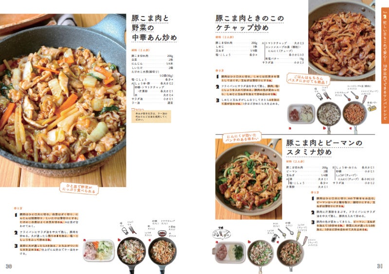 本書には、少ない食材でも物足りなさを感じさせないボリューム満点のレシピが揃っています。今回はワンパン10分、「お肉ともうひと食材」の組み合わせで驚くほどご飯がすすむ3品を厳選してご紹介します。