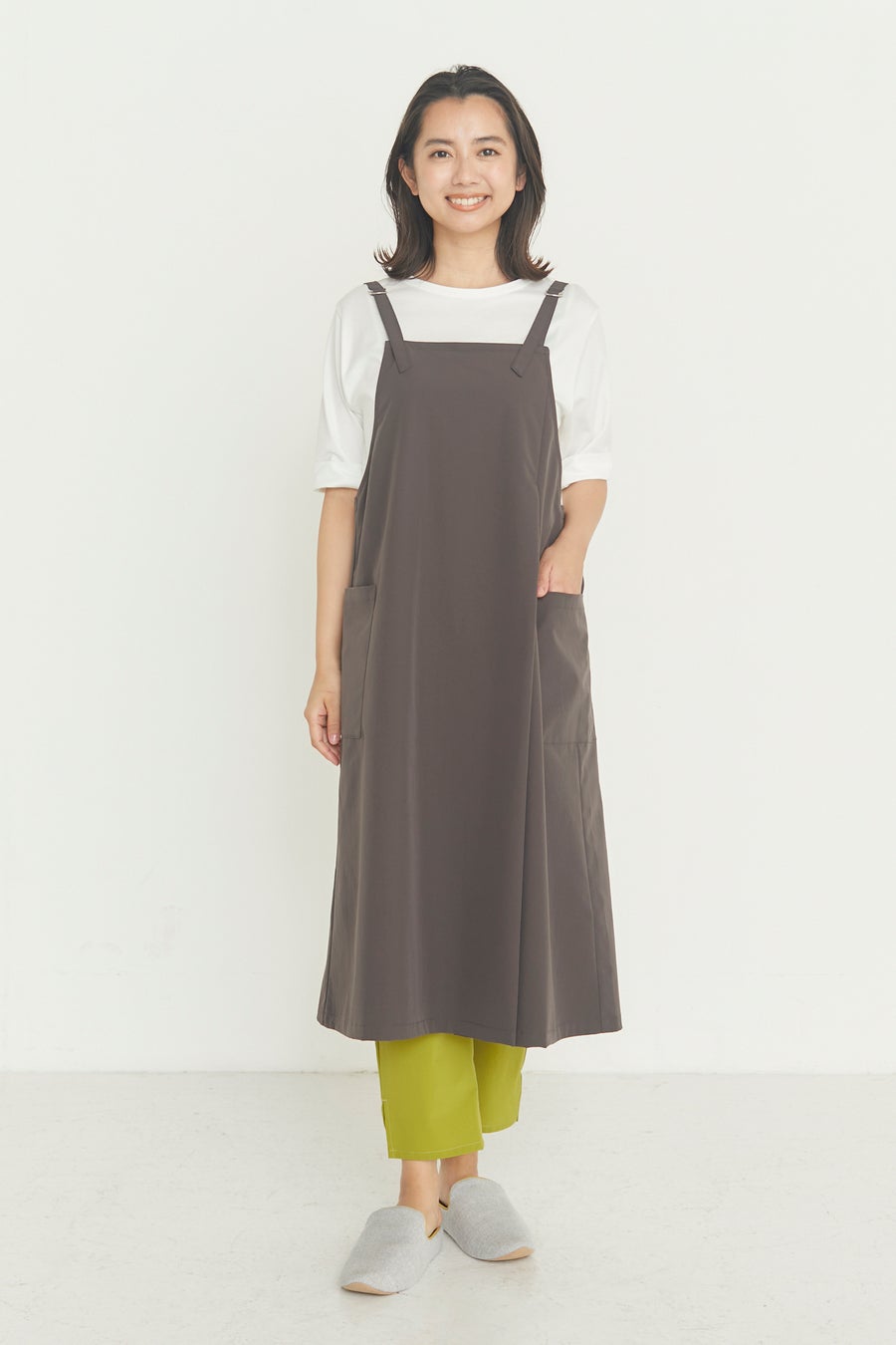 機能性とデザイン性を兼ね備えた、家事が楽しくなるエプロン。食品防汚・消臭・抗菌防臭と、清潔を保ちたいエプロンに嬉しい機能を施しました。フロントのタックデザインがポイントでワンピース風に着用できるため、コンビニやスーパーなどちょっとした外出時にも便利です。シワになりにくく、洗濯機で手軽に洗えるイージーケアで、身長や体型に合わせて肩ひもの長さ調節も可能。両サイドには大きめのポケットもついています。同素材の巾着バッグは持ち運びしやすいだけでなく、バッグインバッグとしても活躍します。ご自分用にはもちろん、ギフトにも最適です。