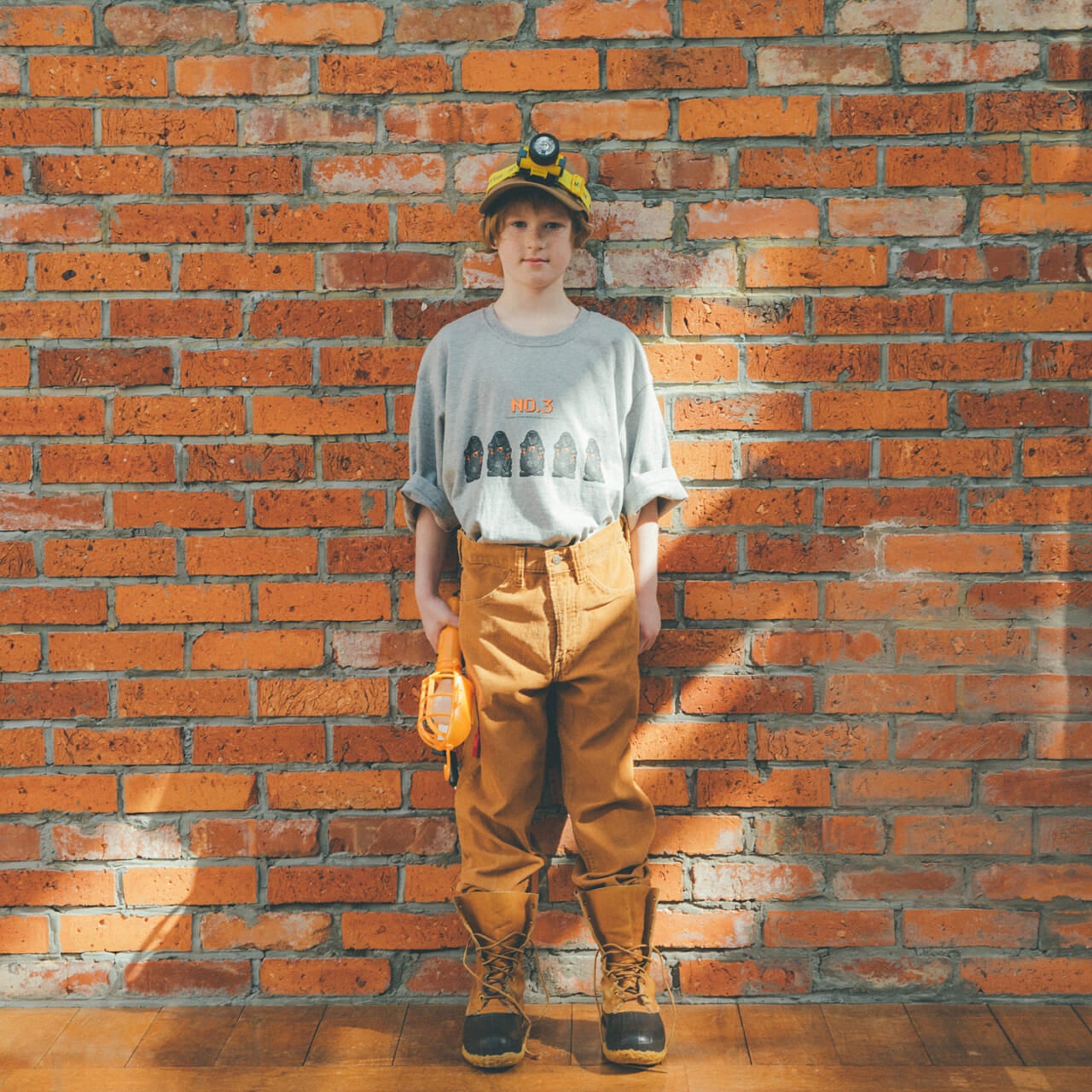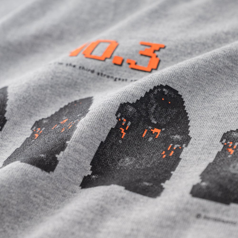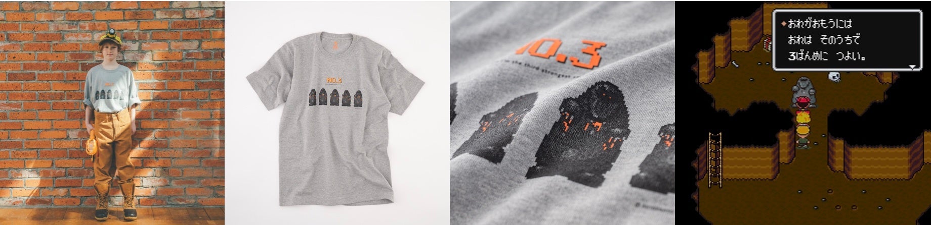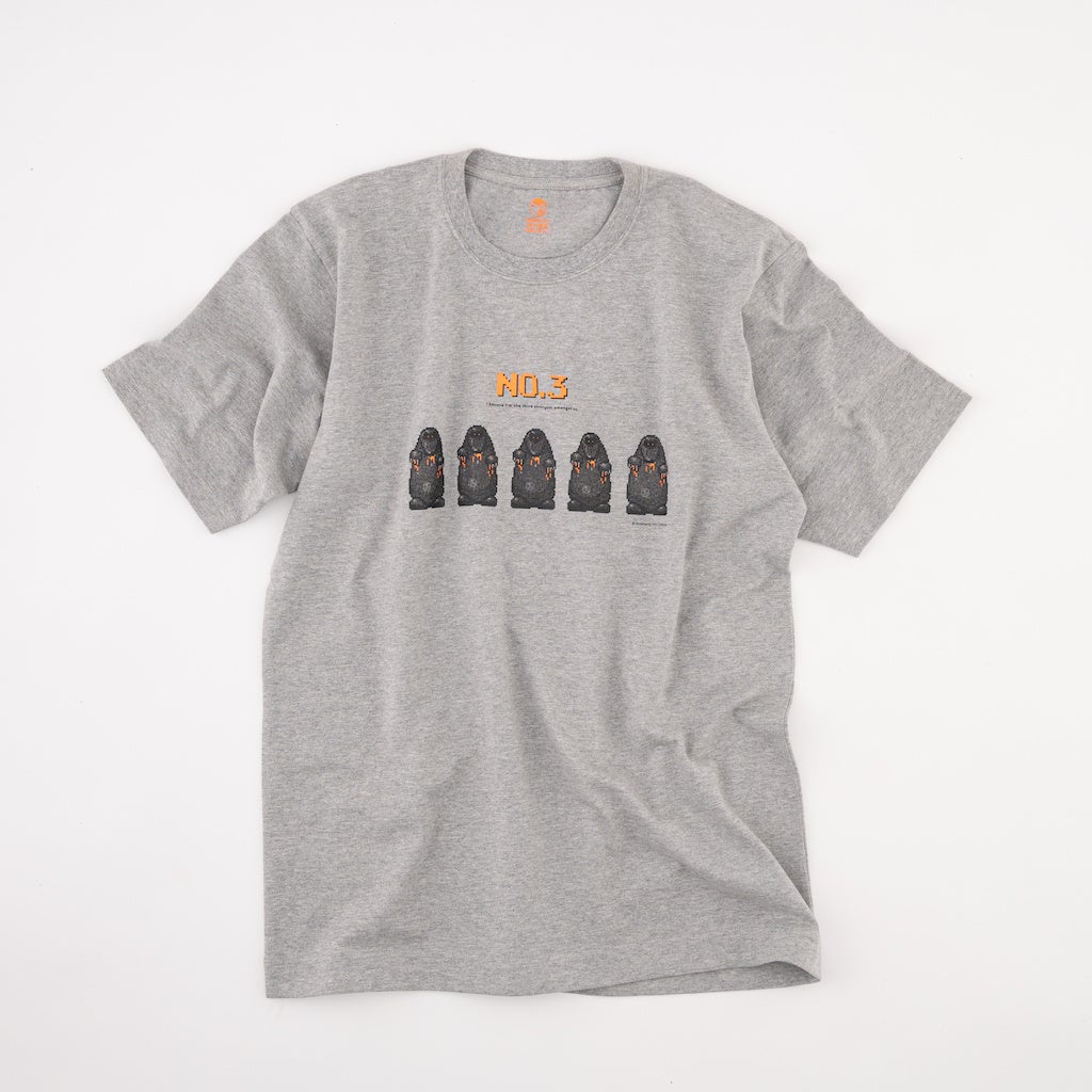 強いんだか弱いんだかわからない、愛すべき敵キャラクター、「あなのぬし」を5匹一列に並べました。彼らのうしろには、堂々と「NO.3」の文字。オリジナルのドット絵をよく見ると、意外にスプラッターな「あなのぬし」、滴る血は、ポップに蛍光オレンジで表現しました。添えられた英文「I believe I'm the third strongest amongst us.」は『MOTHER2』の英語版、『EarthBound』からの引用です。カラーは杢グレー、サイズはLLのワンサイズです。どんな身長のひとも、大きめにダボッと着てください。