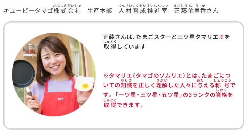 キユーピーグループでは、2019年から社内認定制度「たまごスター」の資格を持った従業員が活躍しています。三ツ星タマリエ検定取得(一般社団法人 日本卵業協会)に加え、卵の知識を正しく伝えるための勉強会に参加することで認定されます。『食生活アカデミー』のコンテンツ内「たまごスターに聞いてみよう!」では、今回もキユーピータマゴ株式会社の「たまごスター」が卵の豆知識をお伝えします。