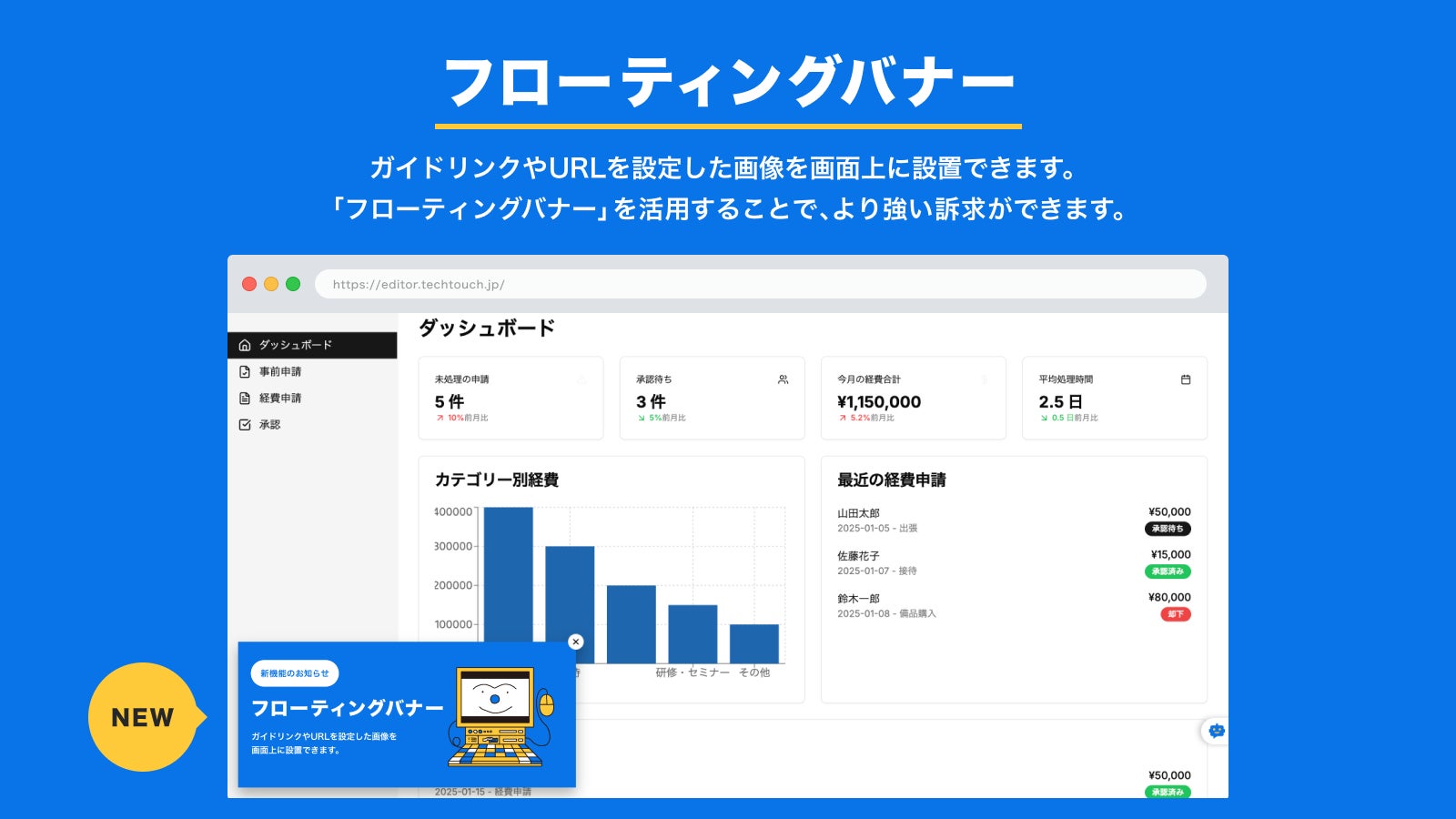 そこでテックタッチは、これまで提供してきたノーコードの操作ガイド機能の知見を活かし、通知・導線・操作支援を一つに統合しながら、高度なアクション誘導をノーコードで実現できる新機能「新型フローティングバナー」を開発しました。