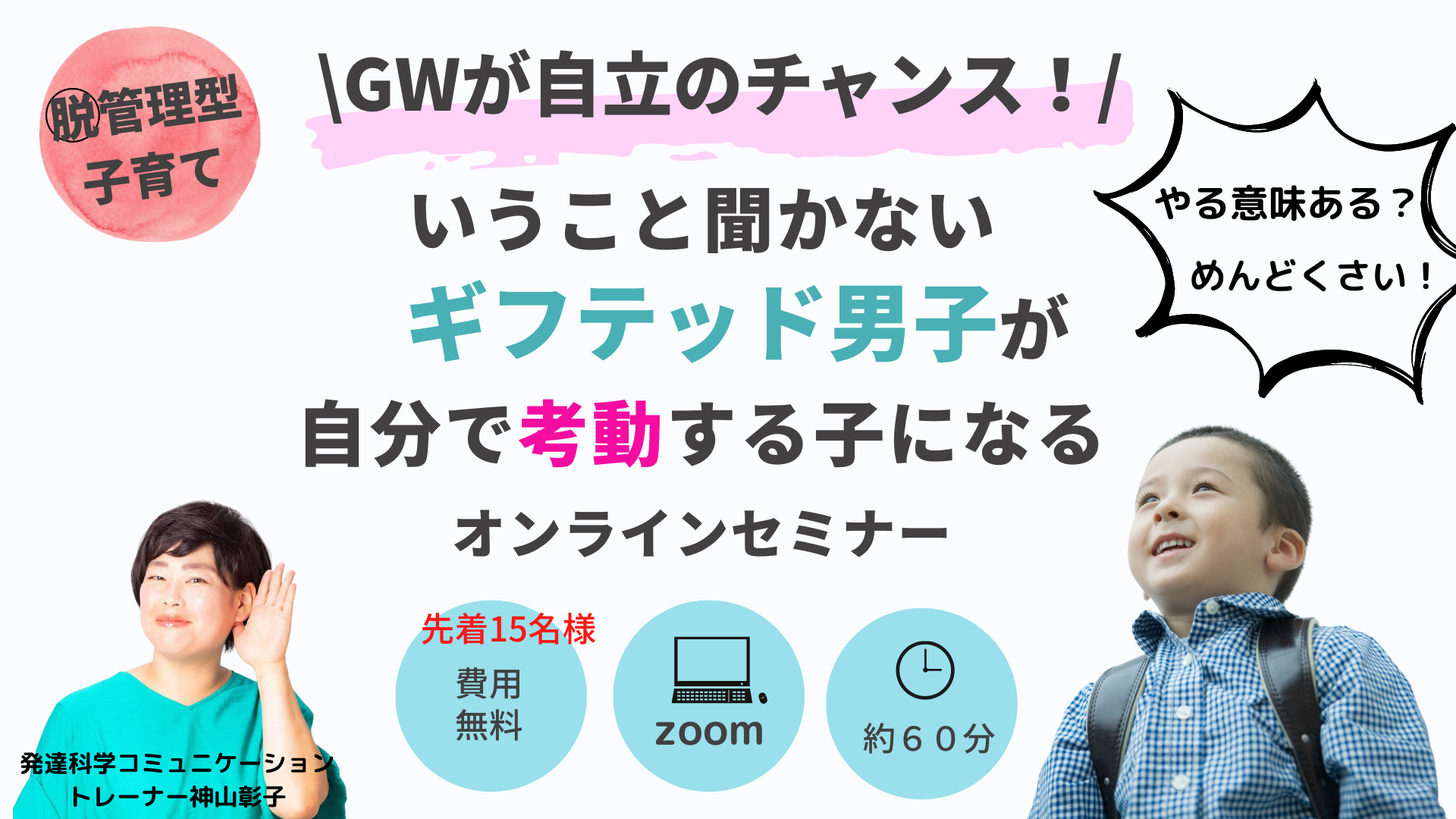 子どもの才能を潰さず伸ばすGW5/1,2,3セミナー、言うことを聞かないギフテッド(2e)男子が自立する「脱管理型子育て!」親の接し方を身につけるオンラインセミナー15名無料ご招待