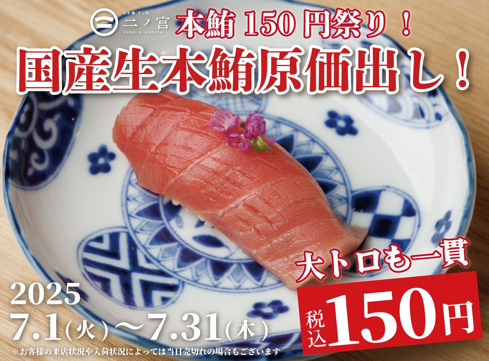 株式会社ビリオンフーズ(本社:東京都港区 代表:中村雄斗)が運営する『日本橋 すし処 二ノ宮 本厚木店』では7/1(火)~7/31(木)の期間、国産生本鮪を150円(税込)でお楽しみいただけるキャンペーンを開催いたします。