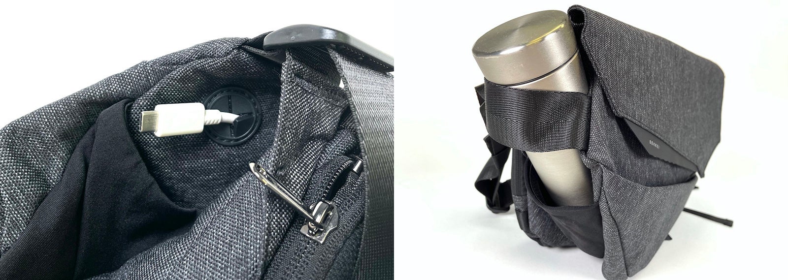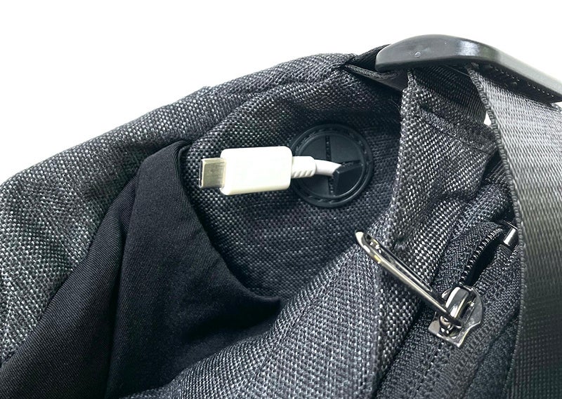 サイドにはUSBケーブル用ポートを設置し、左右のサイドポケットはボトルホルダーになるほか、ランニングやサイクリングなど走ったり激しく動きながら利用する際に便利な3点固定ベルトも付属します。
