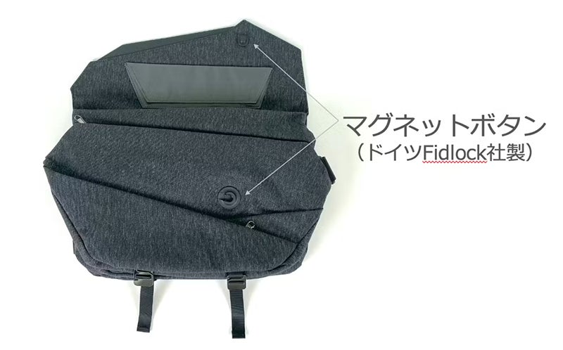 フラップの開閉にはドイツ Fidlock社のボタンマグネットを採用。高いセキュリティ性を誇るほか、自由なデザイン性を実現しました。