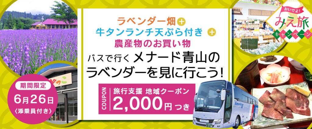 6月26日(月)限定《全国旅行支援対象》割引後旅行代金7,600円〈添乗員付き〉ラベンダー畑+オススメランチ+農産物のお買い物 【三重にメナード青山にラベンダーを見に行こう!】