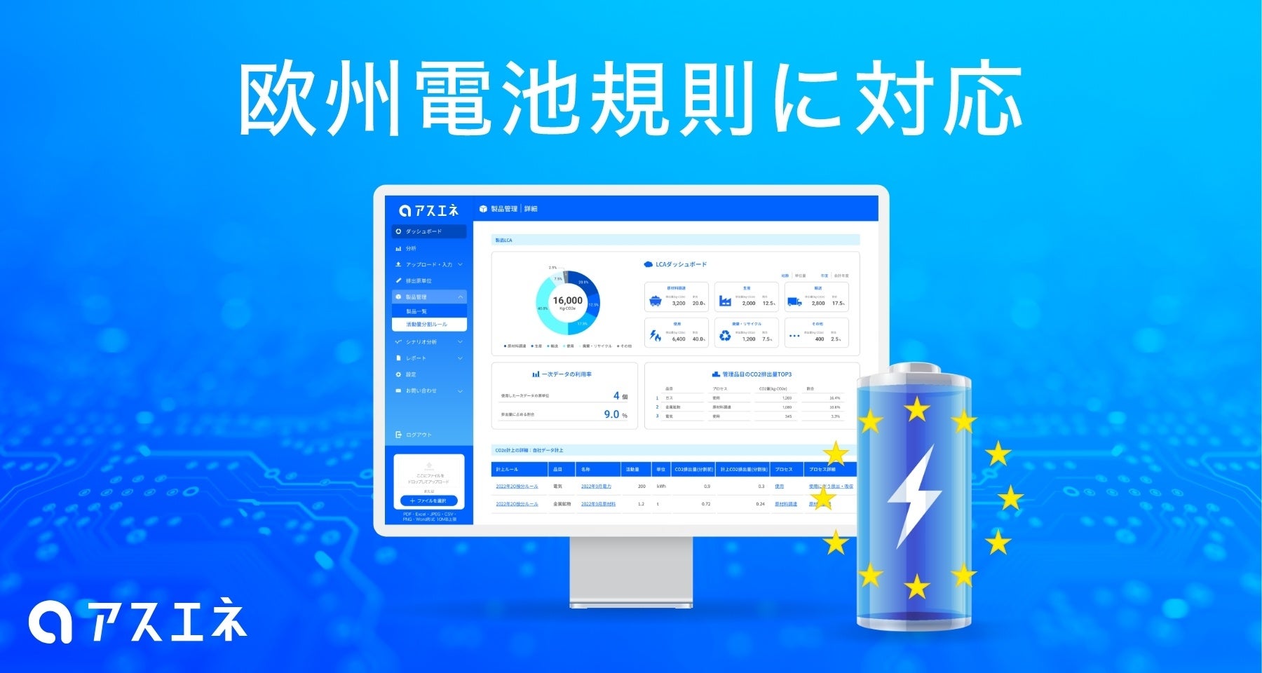 CO2排出量見える化・削減クラウド「アスエネ」、欧州電池規則対応のための包括的ソリューション「Asuene Batteries」を提供