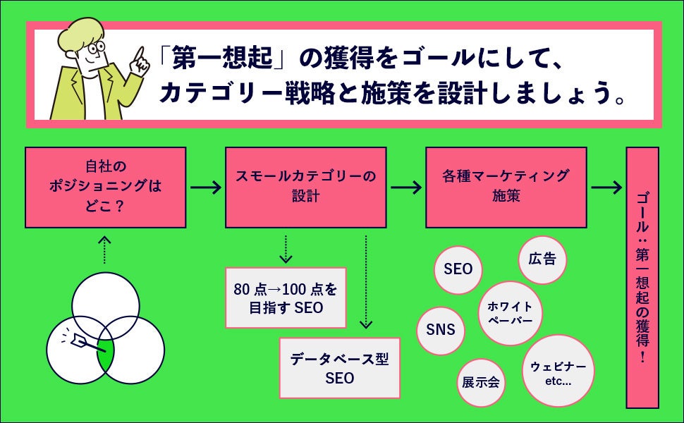 本書は、自社の製品・サービス、ブランドが「第一想起」を獲得することをゴールに設定し、その道筋となる戦略と戦術(施策)を体系的に学んでいただけるよう構成しています。